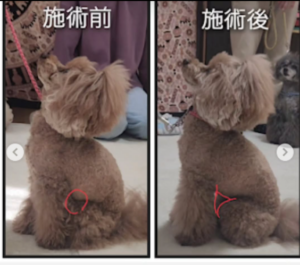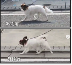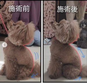 施術前左の後ろ足を前に引き出すのに合わせて坐骨が下がっているのがよく見ると分かります。