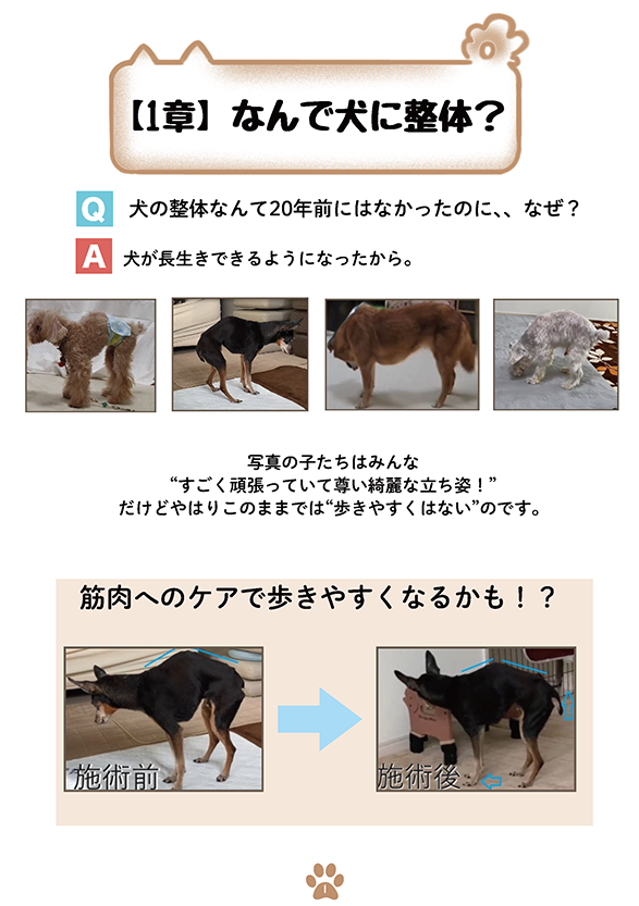 興味はあるけど踏み出せない。という方に向けて犬の整体のしくみから、骨格と筋肉を知識を学び具体的なほぐし方までを網羅した”犬の整体ハンドブック”を作りました。